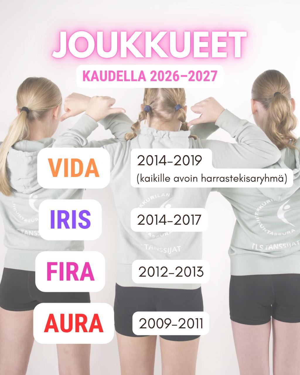 Järjestämme koetanssit kauden 2026–2027 joukkueisiin keskiviikkona 13.5. Jokiniemen koululla (tiilitalo) seuraavasti: